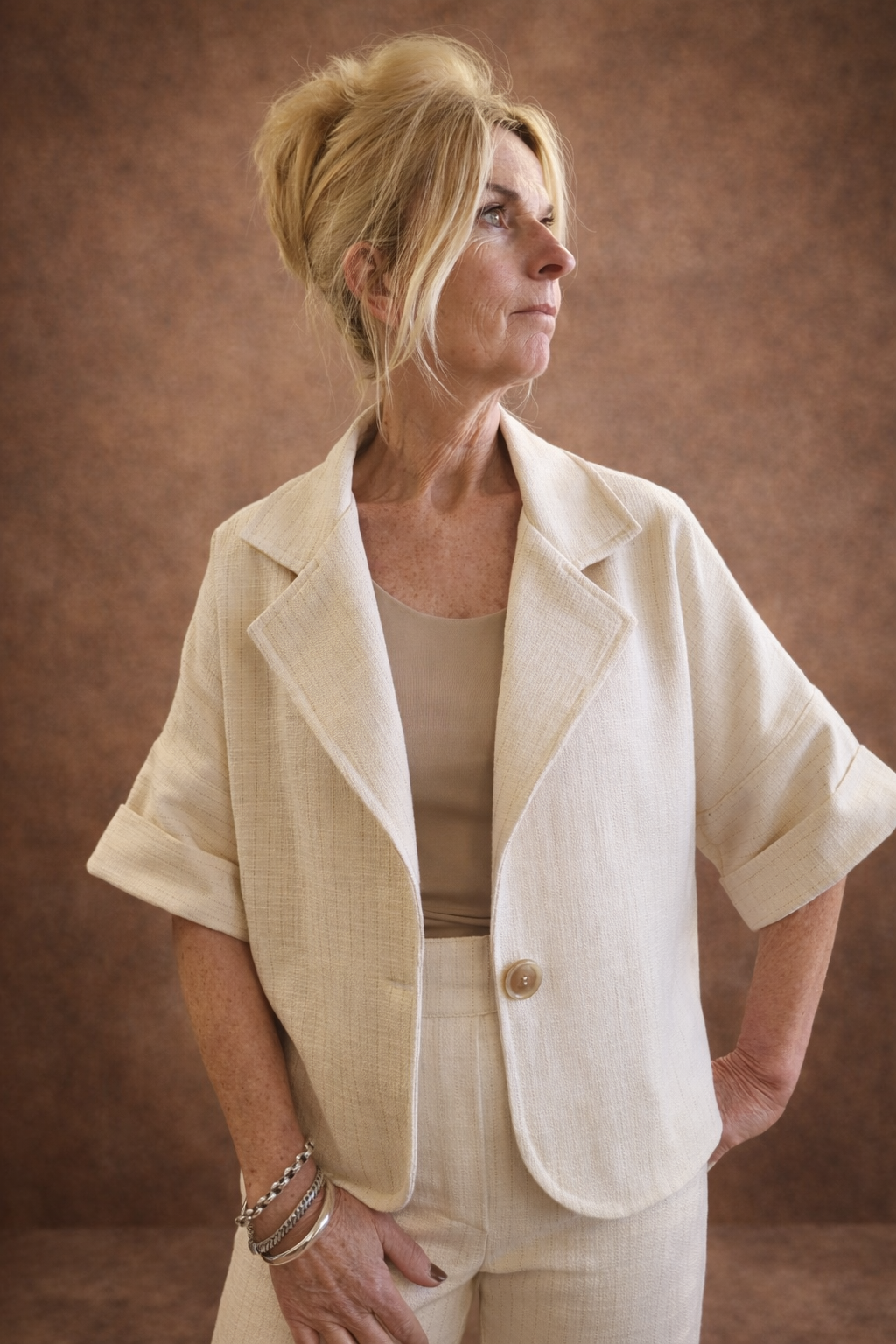 Soepel vallende stof met voldoende grip wat tot zijn recht komt bij een broek, jasje, rok